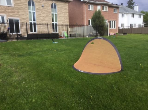 I took the top photo from the new bike path that runs along the ridge overlooking the encroached property. Those two orange tent structures are golf practice nets that I've seen pitched there for months on end without ever being used. Over the past five years I’ve seen many other instances where they leave an array of children’s toys over that lawn to serve as as props that make pedestrians think they’re intruding into someone’s backyard. In winter they flood the area to create a skating rink, thereby asserting occupational ownership.