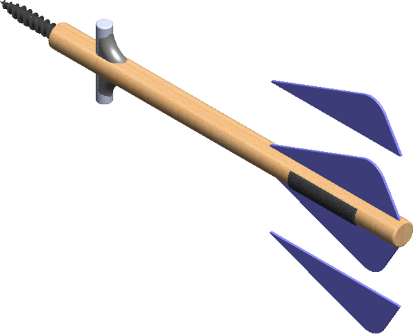 This version is similar but utilizes some easily-procured components that are used for making conventional archery arrows (the carbon shaft and the plastic fletching vanes)